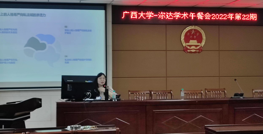6月14日中午12点到13点,jdb电子游戏官方网站在201报告厅成功举行jdb电子游戏官方网站-沵达律师事务所第二十二期学术午餐会。本次会议主题是“人格尊严的宪法保护能力研究”,由任巧博士主讲,许光耀教授主持。