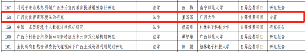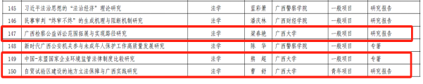 11月1日,2023年广西哲学社会科学研究课题立项名单公布公示,jdb电子官网梁春艳、熊超、曹舒、董笃笃等4位教师申报的课题获得本次立项。此次广西哲学社会科学研究课题法学学科共立项17项,jdb电子官网占比达到23.5%。