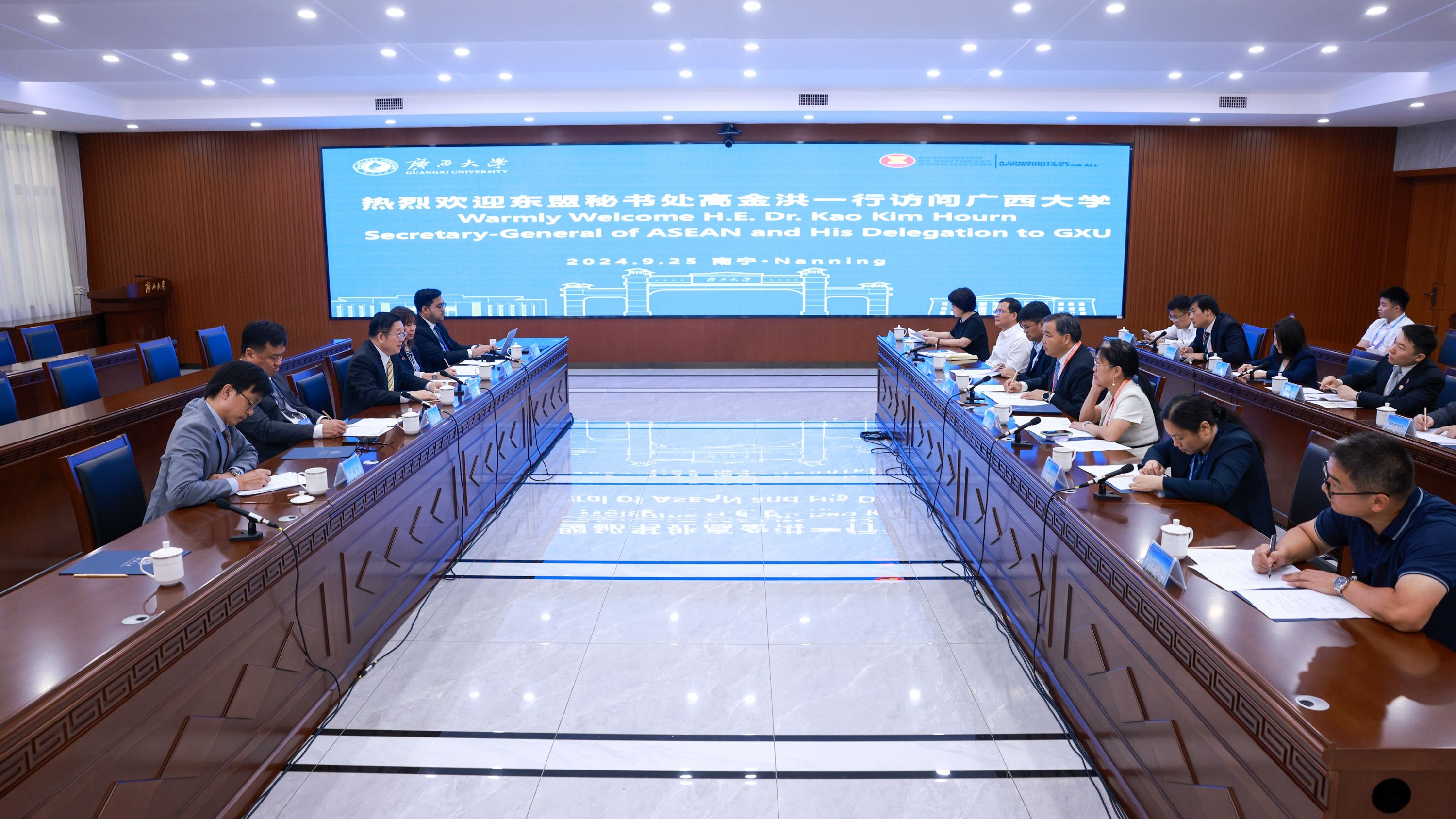 9月25日,东南亚国家联盟秘书长高金洪(Secretary-General of ASEAN, H.E. Dr.Kao Kim Horn)携代表团访问jdb电子游戏官方网站,并与师生代表交流、座谈。jdb电子官网校长韩林海、副校长肖建庄会见来宾。