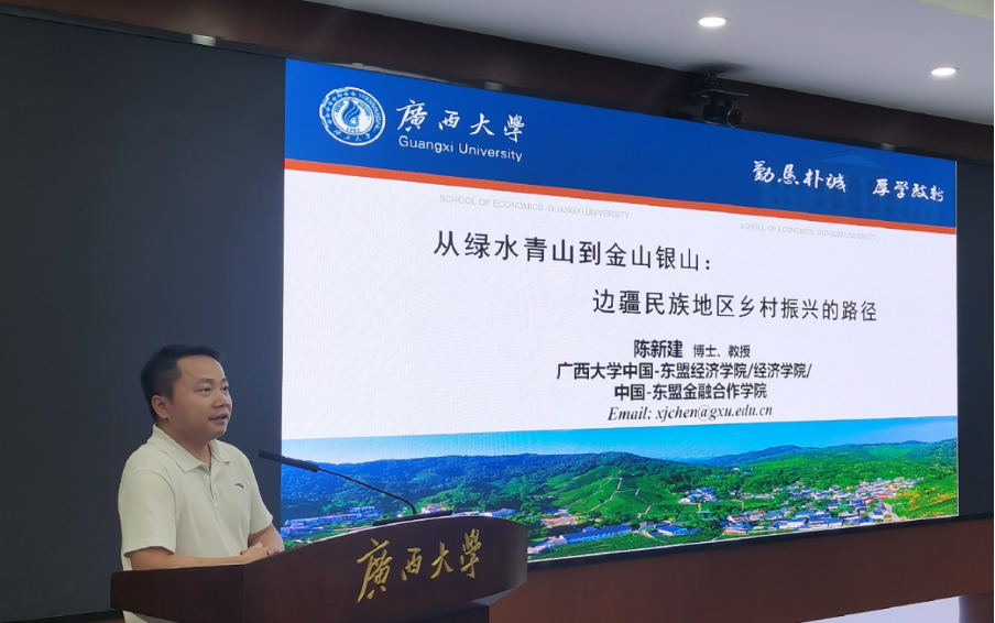 jdb电子游戏官方网站中国—东盟经济学院/经济学院/中国—东盟金融合作学院教授陈新建作了以“从绿水青山到金山银山:边疆民族地区乡村振兴的路径”为主题的报告。他对“乡村振兴”的基本定义作出阐述并对党的二十大关于乡村振兴的政策进行了分析,并对西部边疆民族地区山区石漠化地区众多、生态环境条件较差、交通不便、土地贫瘠、生产生活条件较差等发展困境进行了揭示,指出了边疆民族地区乡村振兴的绿色发展之路在于践行新发展理念,扎实推进现代特色农业绿色发展;健全自然生态,让农产品增强绿色生态价值等举措。