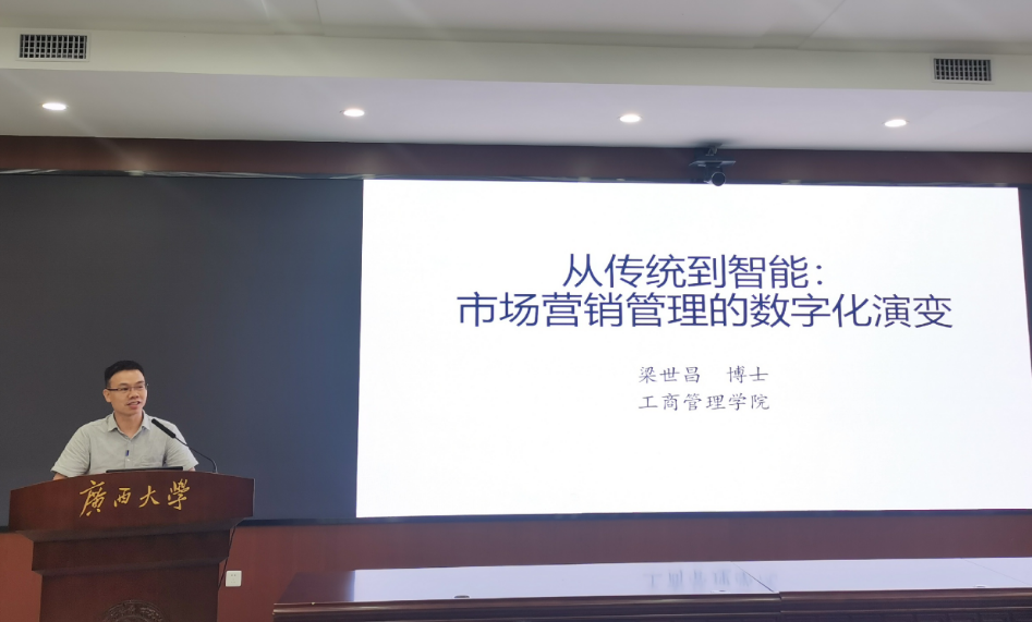 jdb电子游戏官方网站工商管理学院副教授梁世昌作了以“从传统到智能:市场营销管理的数字化演变”为主题的报告。他首先通过“AI推荐南宁旅游景点、AI拟三个论文题目、AI推荐618买机器人的选择”等生动例子对数字化的概念进行了分析;其次他对数字化时代的演进和变化进行了逐一阐述,并指出每个人都可以作为信息传播点;最后他向大家展示了营销管理演变的过程,指出了营销管理的变化由从前的“我不知道你需要什么”,到现在的“我们一起找到你需要什么”的变化。