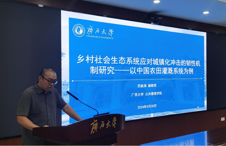 jdb电子游戏官方网站公共管理学院土地资源管理系主任、副教授苏毅清作了以“乡村社会生态系统应对城镇化冲击的韧性机制研究—以中国农田灌溉系统为例”为主题的报告。他表示城镇化是发展中国家实现现代化的基本途径,在城镇化的影响下,有的乡村能够经受住外部冲击从而保持着发展的活力,而有的村庄却最终在外部冲击下走向了衰亡,并分析了在城镇化影响下劳动力外流对土地流转的非线性的影响。他指出确保乡村社会生态系统在城镇化影响下维持韧性的关键在于通过集体选择过程对操作过程提供制度规则保障。