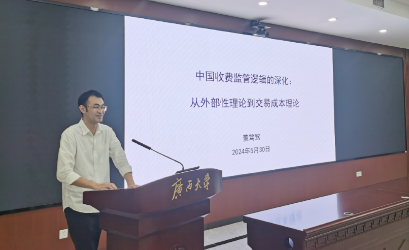 jdb电子游戏官方网站副院长、副教授董笃笃作了以“中国收费监管逻辑的深化:从外部性理论到交易成本理论”为主题的报告。他从收费的定义出发,通过列举与大家息息相关的例子对“利用行政权力收费”与“特定领域收费”进行了区分,并对“传统收费监管的理论逻辑:外部性理论”进行了图示阐述,指出了外部性理论的不足,强调要通过行政事业性收费,鼓励交易,充分发挥价格机制的积极作用,通过经营性收费,鼓励交易、促进竞争。