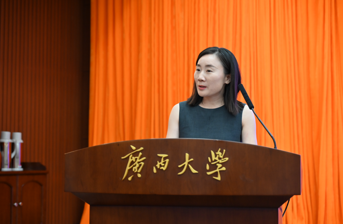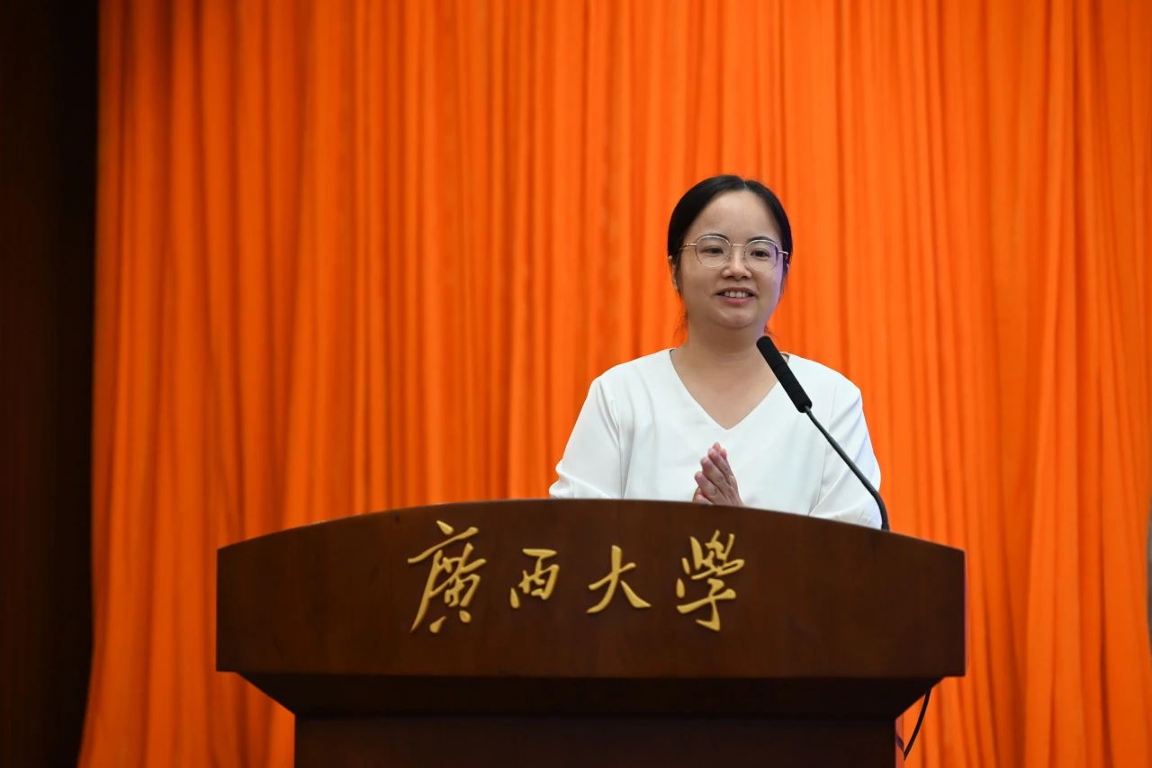 陆凌副教授作为教师代表上台致辞。她从刑法学的几个小问题出发,以幽默风趣的方式引导新生对未来进行正确的思考,让新生感受到法学专业的魅力。同时,她也表达了对新同学们的关心和期望,希望大家能够积极与老师沟通交流,共同解决学习和生活中的困难与挑战。