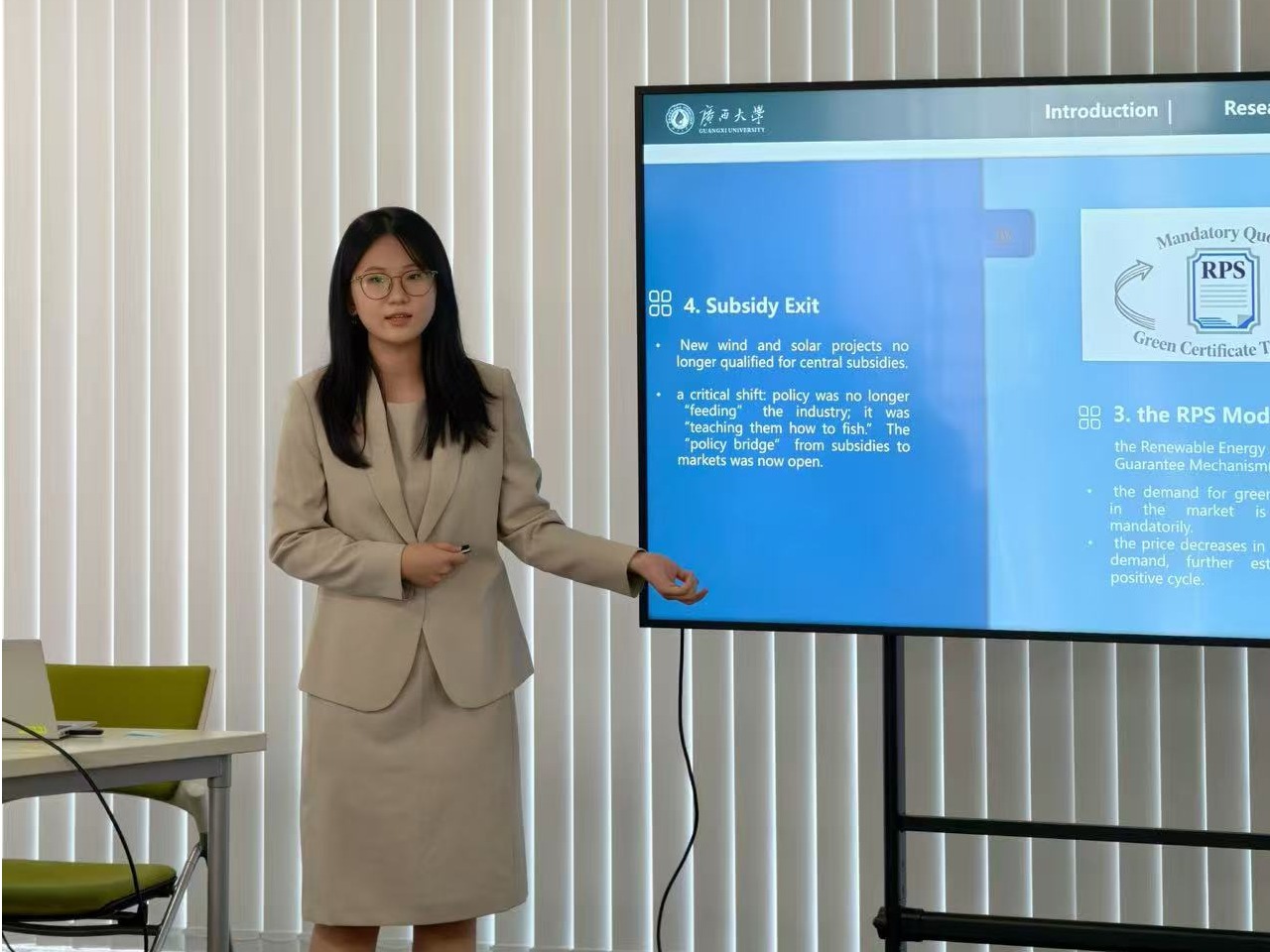刘文慧同学以“Subsidies, GEC and Green Electricity:the Evolution of China's Clean Electricity Transaction Mechanisms(2006-2025)”为题进行汇报,内容涵盖中国能源转型激励措施的三段模型“补贴-绿证交易-绿电交易”等,并与日本学者就中国的转型方式在国际上转化可能性的方面进行深入的交流与讨论,充分体现jdb电子官网学子在国际深度上的思考与深刻理解。
