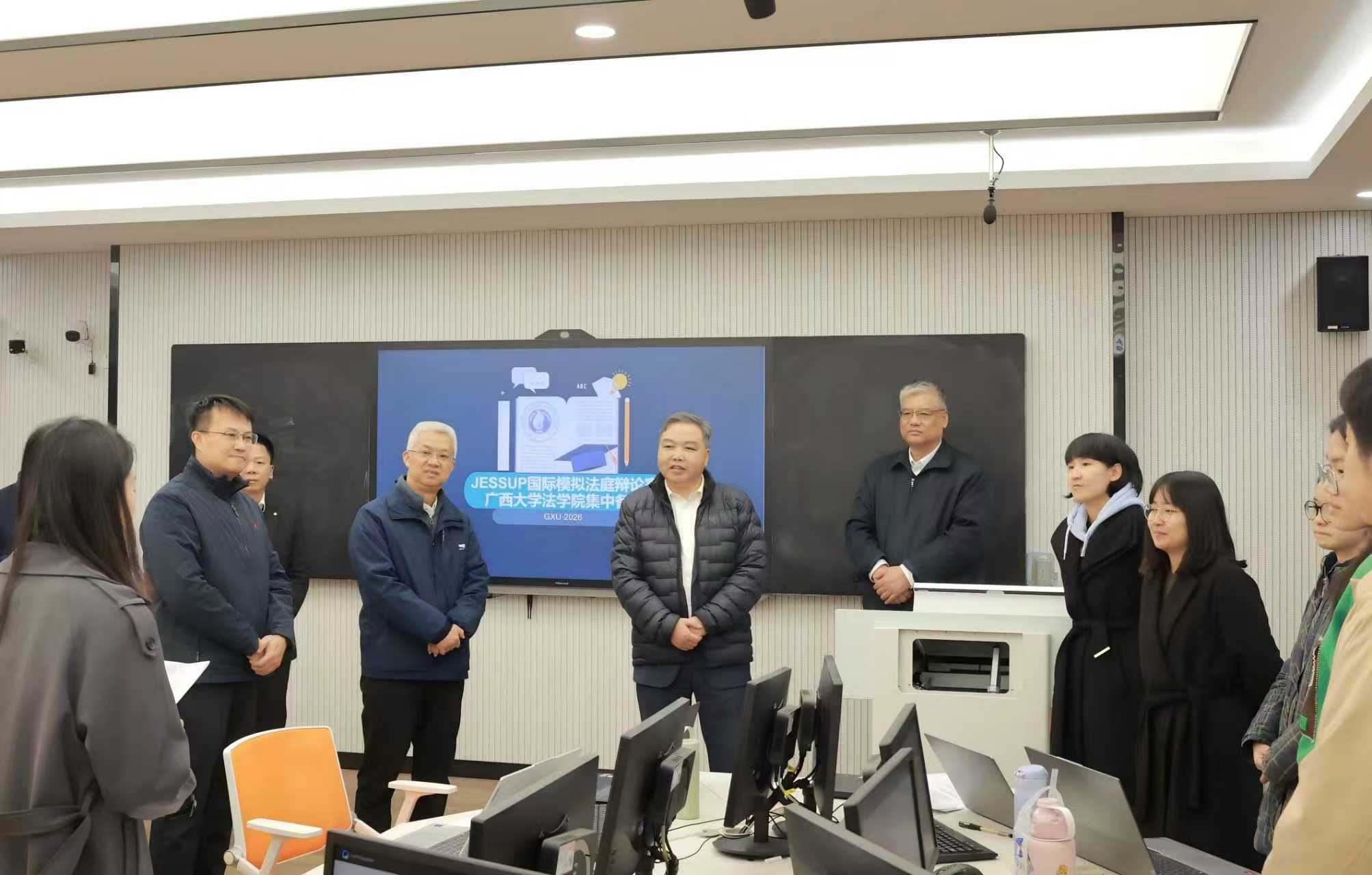 会前,肖建庄一行在学院领导班子陪同下来到法学实验实训中心,与正在备战国际法模拟法庭竞赛的学生们亲切交流,详细了解实验室设施配置与环境情况,并为科研教学保障工作提出指导意见。