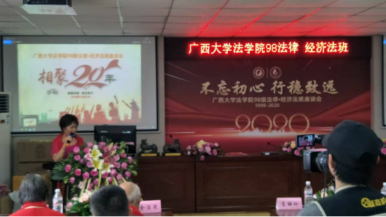 肖丽玲老师、黄俊阳老师以及校友代表冯英艳、蒙林强、玉荣嘉、唐忠兴等先后发言。座谈会上,由玉荣嘉校友担任领誓,手抚宪法,带领三名律师校友身着律师袍面向国旗,并在黄建荣书记的监誓下重温了律师执业誓词。