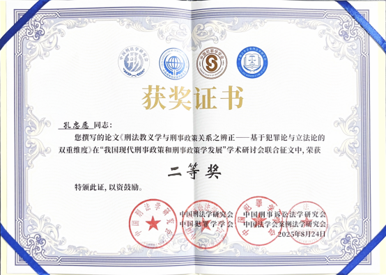 jdb电子官网助理教授孔忠愿撰写的论文《刑法教义学与刑事政策关系之辨正——基于犯罪论与立法论的双重维度》,在“我国现代刑事政策和刑事政策学发展”学术研讨会联合征文中,荣获二等奖。